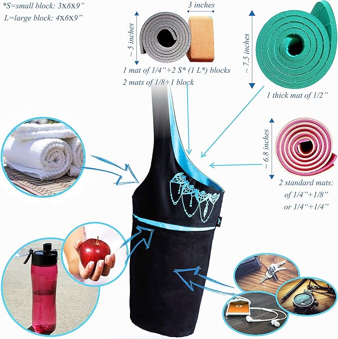 - So. Much. Storage: The top is 13.5 inches wide, so you can store other yoga equipment and accessories like your yoga block and yoga strap! There’s also an extra pocket for water bottle and towel, and even a zipped pocket with a strong YKK Zip for your phone, cards and keys! And here’s what else you’ll love, this yoga mat tote has reinforced stitched seams, with Heavy Duty 8oz Canvas and holds up to 20lbs!