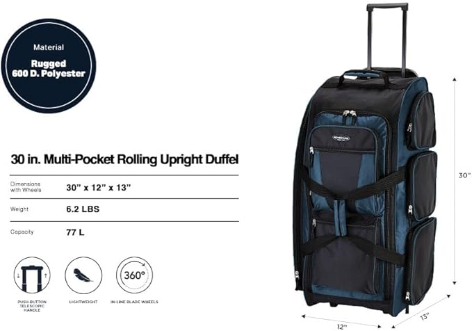 - Extra-Large 77L Rolling Luggage Capacity: Oversized 30” rolling duffel suitcase provides approximately 77 liters of packing space, ideal for extended travel, family trips, sports travel, and bulk packing