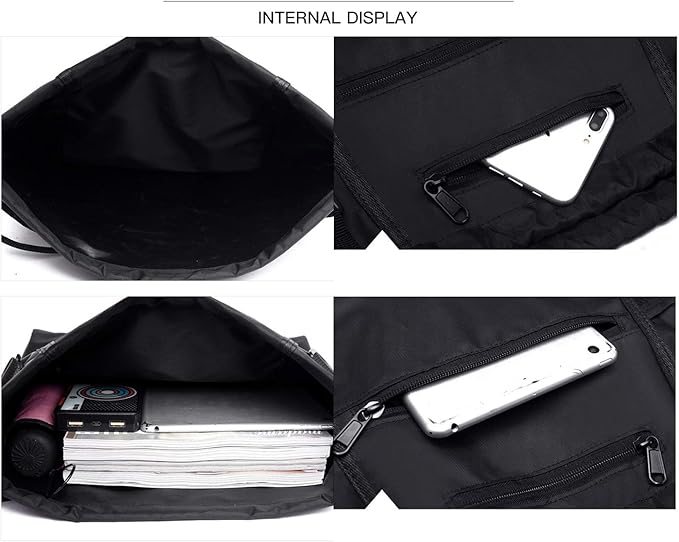 - Ample storage space---Drawstring backpack includes a oversize main compartment with a small zippered pouch for wallet and cell phone, a medium zipper closure compartment , two shoe compartments, two mesh compartments and a card window