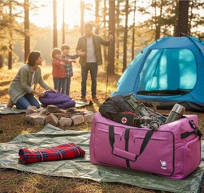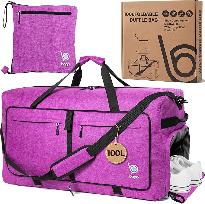 Bago Large Foldable Duffel Bags for Traveling Women & Men - 100L Packable Duffle Bag for Travel with Shoe Compartment - Water Repellant, Heavy Duty, Lightweight Folding & Collapsible (SnowPink)