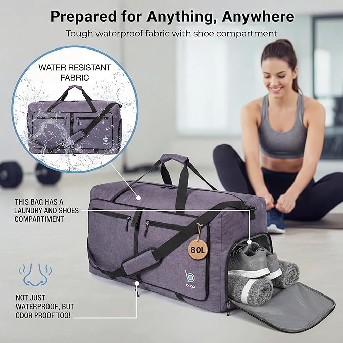 Bago Large Foldable Duffel Bags for Traveling Women & Men - 80L Packable Duffle Bag for Travel with Shoe Compartment - Water Repellant, Heavy Duty, Lightweight Folding & Collapsible (SnowBlack)