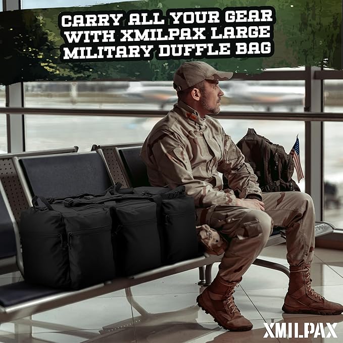 • This large military duffle bag is constructed of rugged 600D polyester fabric with #10 heavy duty zipper and quality buckles in whole bag for using in tough condition.Ideal as duffle bag, deployment bag, tactical gear load out bag, cargo bag, travel duffel bag, bug out bag,base camping bag, etc.