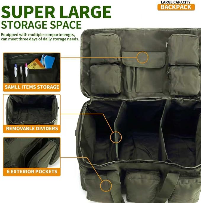 - 【Duffle Bag with Dividers】The 55L military duffle bag measures 24" x 12" x 12". This military travel bag with a large compartment and 6 separate pockets. Main compartment may be used in its entirety or use the equipped with 2 padded dividers to splitting the main compartment into smaller sections, and built-in four small pockets and pen slot on cover.