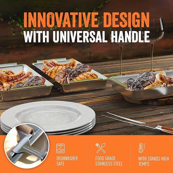 - INNOVATIVE DESIGN WITH UNIVERSAL HANDLE: Your new BBQ set also includes a convenient handle that clips and unclips on any basket to ensure easy and safe serving even for the hottest grilling pans!