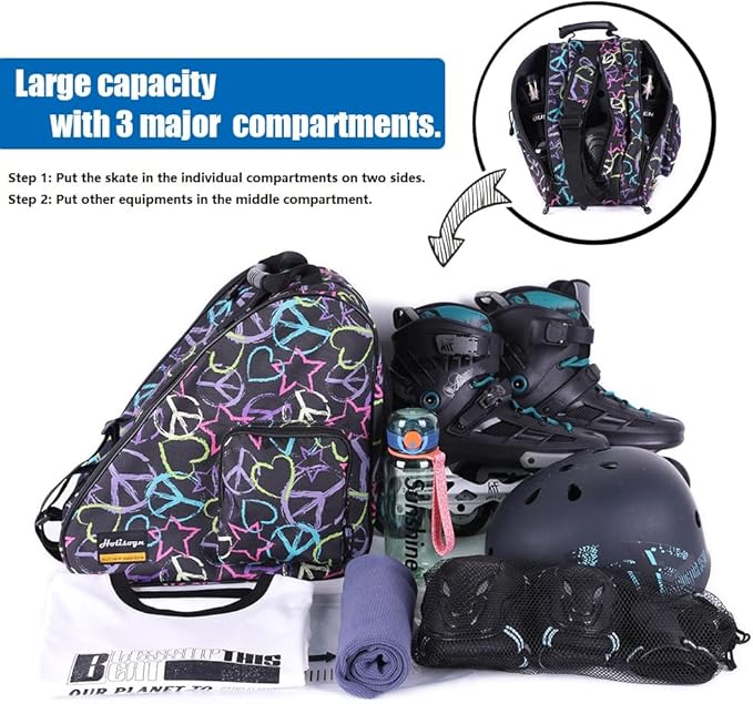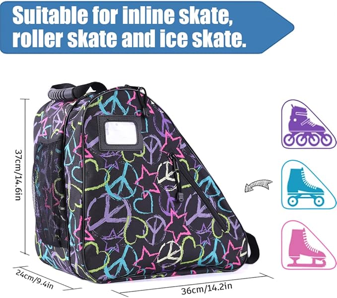 Holisogn Ice, Figure, Inline and Roller Skate Bag, Premium and Fashion Bags for child, kids, teenager, adult (Peace & Love Black HLS002)