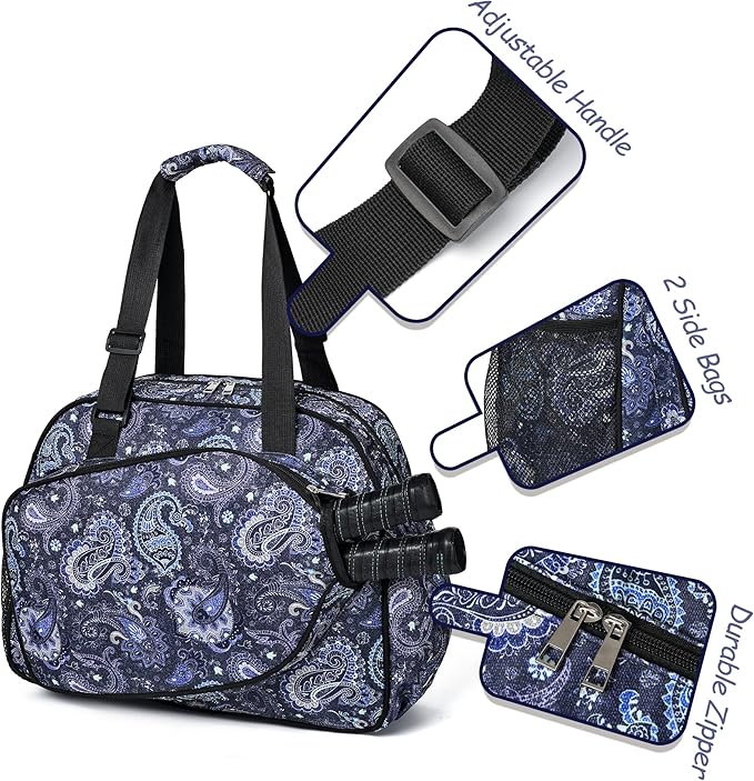 - Premium Pickleball Bag: Boulder Bee pickleball bag is made of 600D oxford nylon cloth outer and 210D nylon interior. Durable and soft material with gliding smooth zippers. Great compact handbag for sports activity. It fits two paddles in the designated paddle holder and has a enough room to hold all your pickleball equipments. Designed for girls pickleball players!