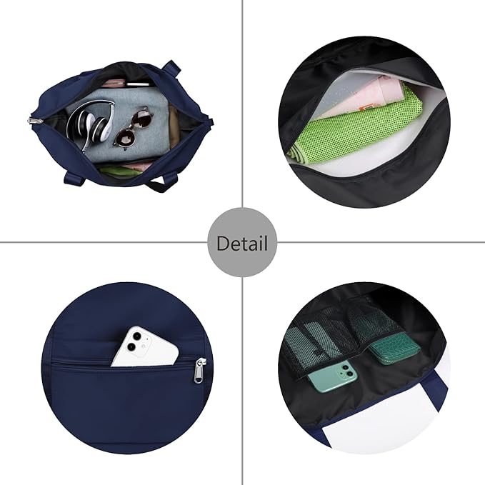 • LUGGAGE SLEEVE: The back side sleeve allows you to slide the duffel over the handle of trolley suitcase/luggage so you donโ€™t have to carry it and it fits easily in the overhead compartment for an airplane travel. The inside zippered pocket(which is leakproof can hold your toiletries and other wet items) and two open pockets inside keep your wallet, cell phone and other valuables safe and organized, featuring one external pocket on back for easy access to passport, card holder etc.