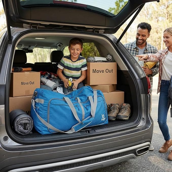 Bago Large Foldable Duffel Bags for Traveling Women & Men - 100L Packable Duffle Bag for Travel with Shoe Compartment - Water Repellant, Heavy Duty, Lightweight Folding & Collapsible (Blue)