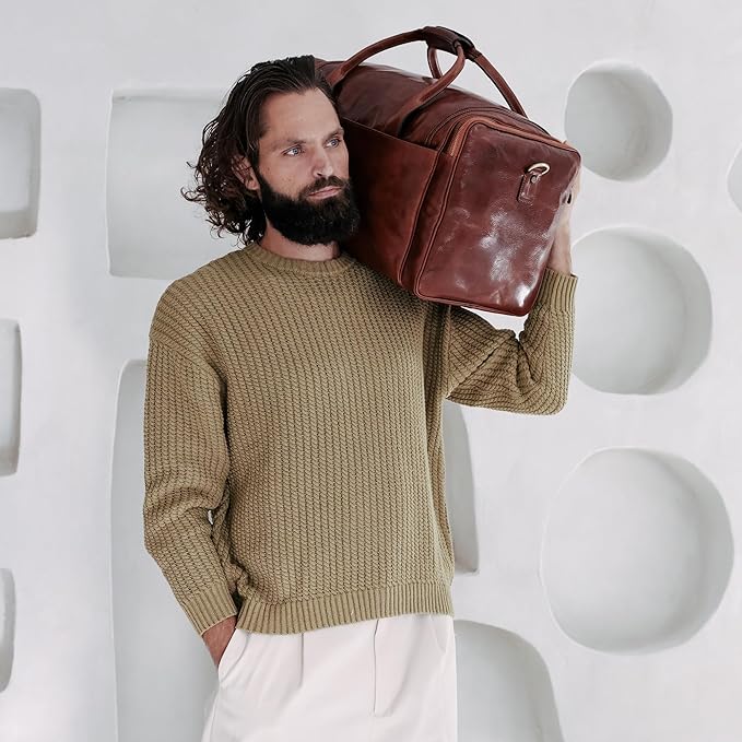 - ✔️ BAG THAT MAKES A STATEMENT – did you know you have only 7 seconds to make a first impression? And every detail matters - this eye-catching leather travel bag will help you to turn heads and catch the COMPLIMENTS, make you feel more confident and good-looking.