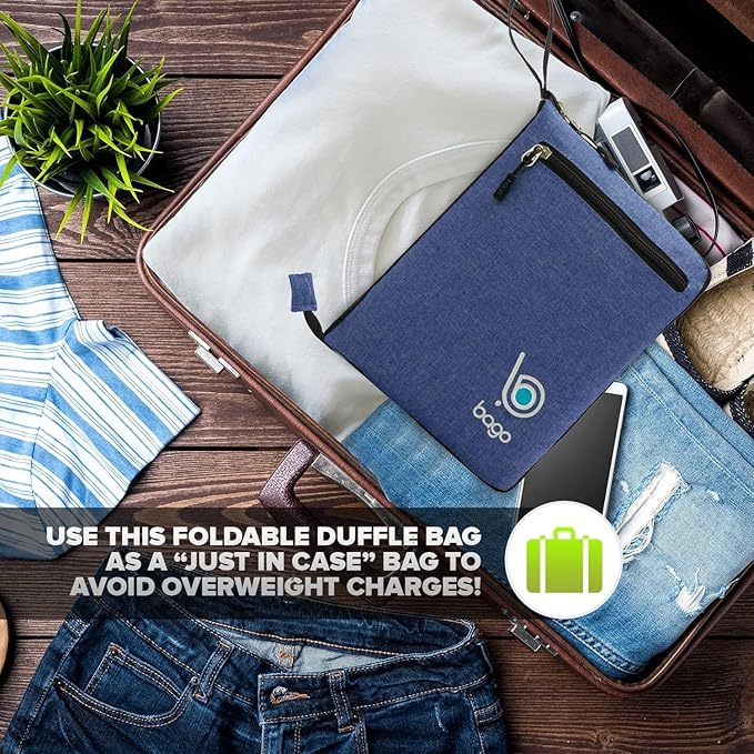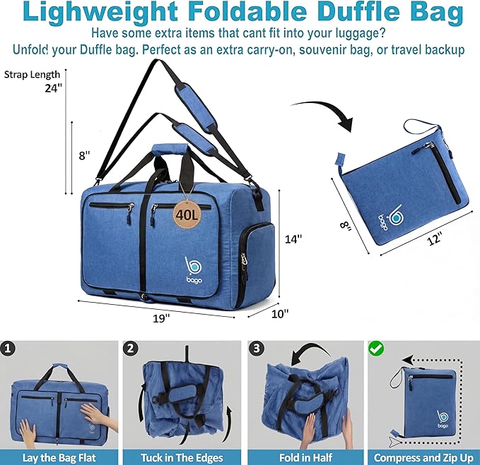 Bago Foldable Duffel Bags for Traveling Women & Men - 40L Sports Packable Duffle Bag for Travel with Shoe Compartment - Water Repellant, Heavy Duty, Lightweight Folding & Collapsible (SnowDepBlue)
