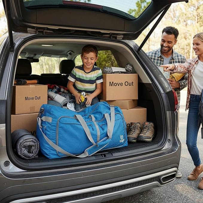 Bago Large Foldable Duffel Bags for Traveling Women & Men - 120L Packable Duffle Bag for Travel with Shoe Compartment - Water Repellant, Heavy Duty, Lightweight Folding & Collapsible (Blue)