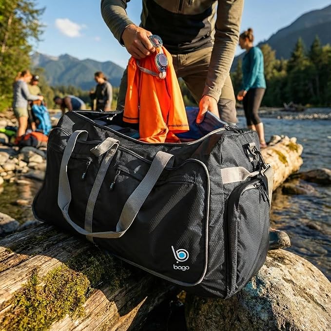 Bago Large Foldable Duffel Bags for Traveling Women & Men - 120L Packable Duffle Bag for Travel with Shoe Compartment - Water Repellant, Heavy Duty, Lightweight Folding & Collapsible (Black)