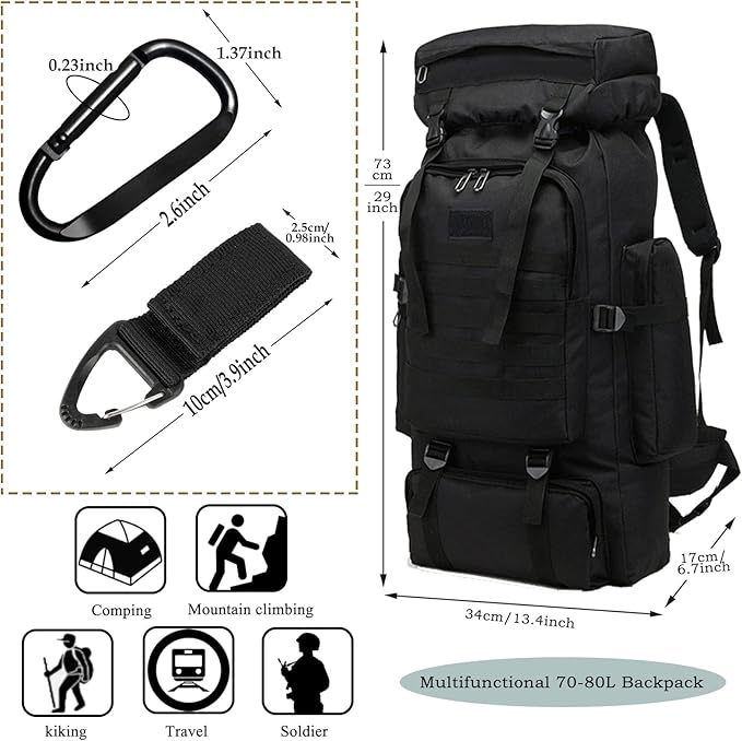- Spacious & Organized Design: This 70L hiking backpack features a large main compartment with a drawstring closure, plus 1 laptop compartment, 1 front pocket, and 2 side pockets for organized storage. Perfect for camping, travel, and outdoor adventures.