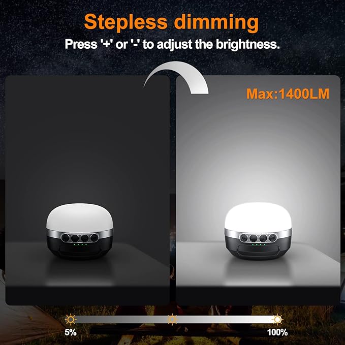 - A 10400mAh Power Bank: Last up to 420 hours after a full charge (at the lowest brightness ) , equiped with a 10400mAh battery, this camping light will charge your phone during your camping/hiking. It's also a nice choice to place it in your bedroom in case of hurricanes or power outages.