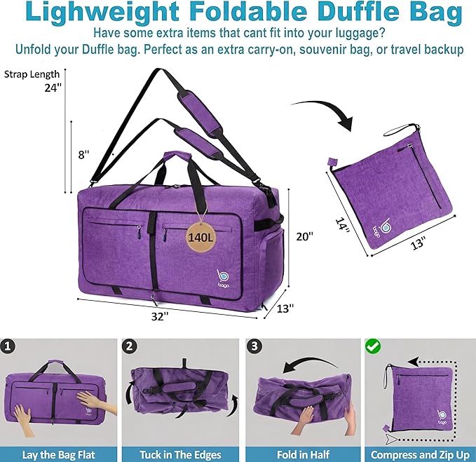 Bago Big XXL Foldable Duffel Bags for Traveling Women & Men - 140L Packable Duffle Bag for Travel with Shoe Compartment - Water Repellant, Heavy Duty, Lightweight Folding & Collapsible (SnowDepPurple)