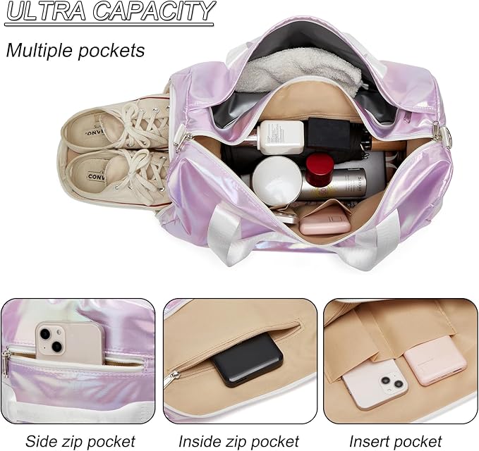 ZHIERNA Sports Gym Dance Bag for Women Girls, Shimmery Waterproof Duffle Travel Bag With Shoes Compartment and Wet Dry Pocket (Purple)