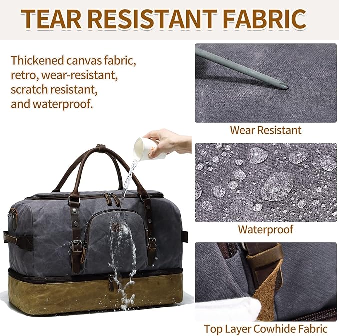 - Quality Material: This weekender bag is made of waterproof durable waxed canvas and quality genuine leather, it is durable in use and rich in looks, handcrafted by skilled craftsmen. 100% quality inspected before they are delivered to you