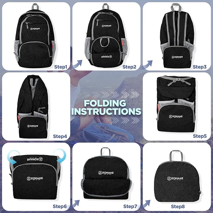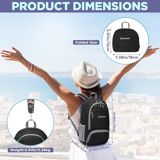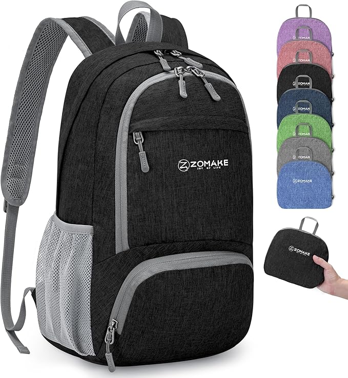 ZOMAKE Ultra Lightweight Packable Backpack 20L,Small Foldable Backpacks Hiking Water Resistant Collapsible Daypack for Women Men(Black-C2)