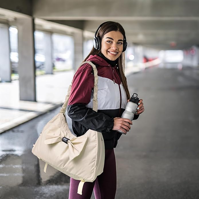 - Size and Material: The women's gym bag, sized at 18x12x7 inches, is made of water-resistant material. It can effortlessly accommodate your outfits and essentials, suitable for various activities like gym workouts, yoga classes, and weekend trips
