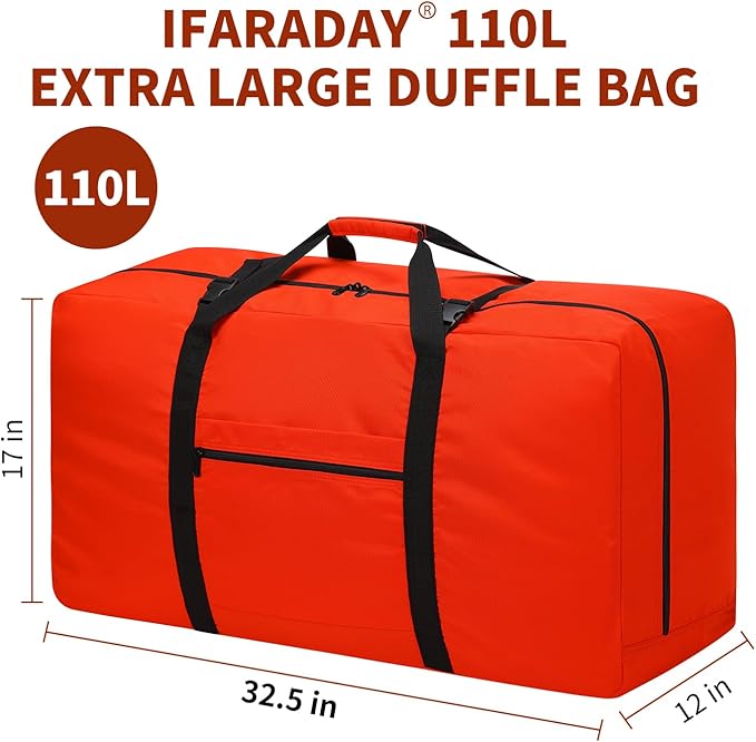 - LARGE CAPACITY DUFFLE BAG: With up to 110L capacity, the extra large duffel bag has 1 main compartment, 1 inside zipper pocket, 1 front zipper pocket, you can easy to organize different of things separatly.