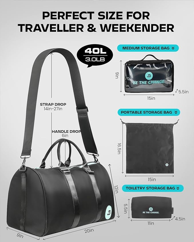- 【Wet and Dry Separation】Travel Duffel Bag comes with additional three high-density waterproof accessory bags for keeping clothes & items dry and clean. Reinforced sewn straps, giving the bag excellent carrying structure and preventing easy deformation. You can pack shoes, toiletries, laundry, or anything else you might need.