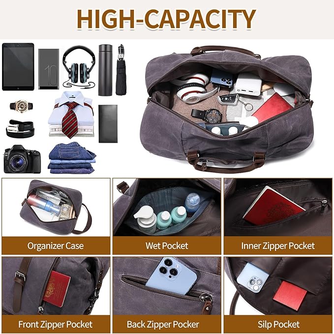 - Quality Material: FENGDONG weekender bag is made of water resistant,durable waxed canvas and top quality genuine leather, it is durable in use and rich in looks, handcrafted by skilled craftsmen. 100% quality inspected before they are delivered to you.