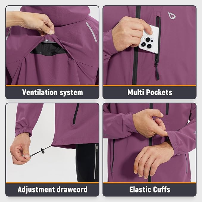 baleaf Men's Rain Jacket Waterproof Windbreaker Raincoat Running Cycling Hiking Gear Hood Lightweight Reflective Packable