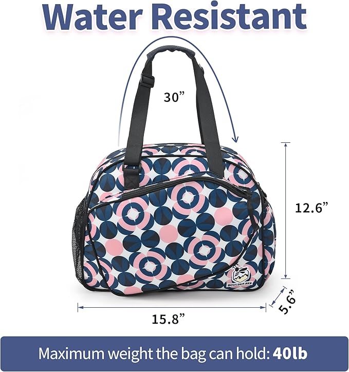 - Premium Pickleball Bag: Boulder Bee pickleball bag is made of 600D oxford nylon cloth outer and 210D nylon interior. Durable and soft material with gliding smooth zippers. Great compact handbag for sports activity. It fits two paddles in the designated paddle holder and has a enough room to hold all your pickleball equipments. Designed for girls pickleball players!
