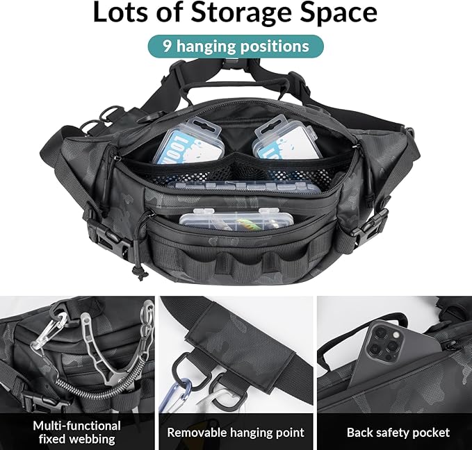 - 【Ample Storage Space】 This waist bag has a total of 5 pockets for easy sorting and storing your fishing tackle. Main compartment size: 11.8x4.7x3.5inch. The front MOLLE net can hold pliers, clippers and etc. six "D" rings can hang various accessories on it. The removable hanging point on the belt is designed for easy access. This fishing bag is just the perfect capacity for a fun day of fishing.