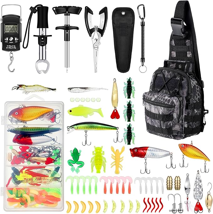 Sosation 134 Pcs Fishing Tool Fishing Tackle Box Kit and Equipment for Adults Beginner Gift, Hook Remover, Pliers Kit, Backpack Tackle Container Lures, Lip Gripper, Weigh Scale