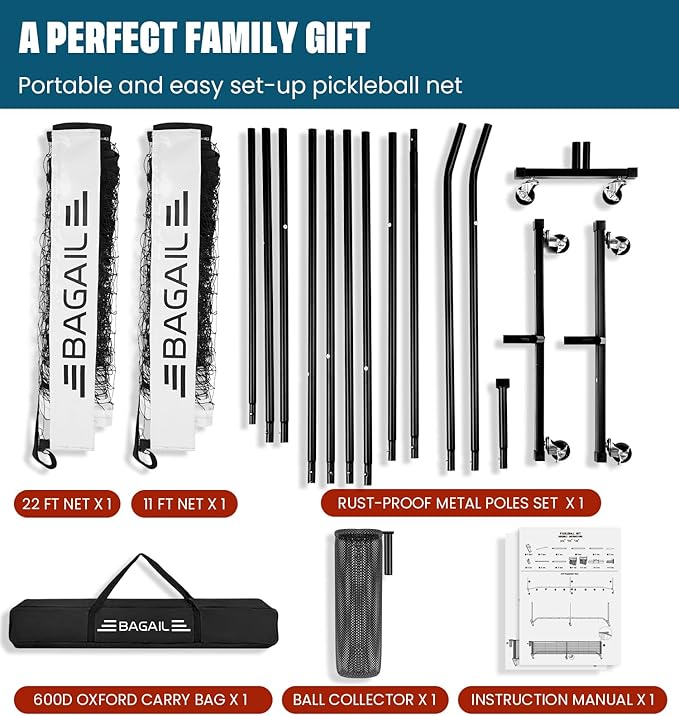 - 22FT or 11 FT Pickleball Net - BAGAIL's latest portable pickleball net features two nets - a full-size (36 "H x 22'W) USAPA regulation net and an 11'W half court practice net. Quickly assemble the frame system into 22FT or 11FT depending on your needs, and play with family or friends anywhere - in your driveway or on the indoor court. Suitable for players of all ages and skill levels. Whether practicing solo sessions or hosting social games, this 2-in-1 pickle ball net has you covered