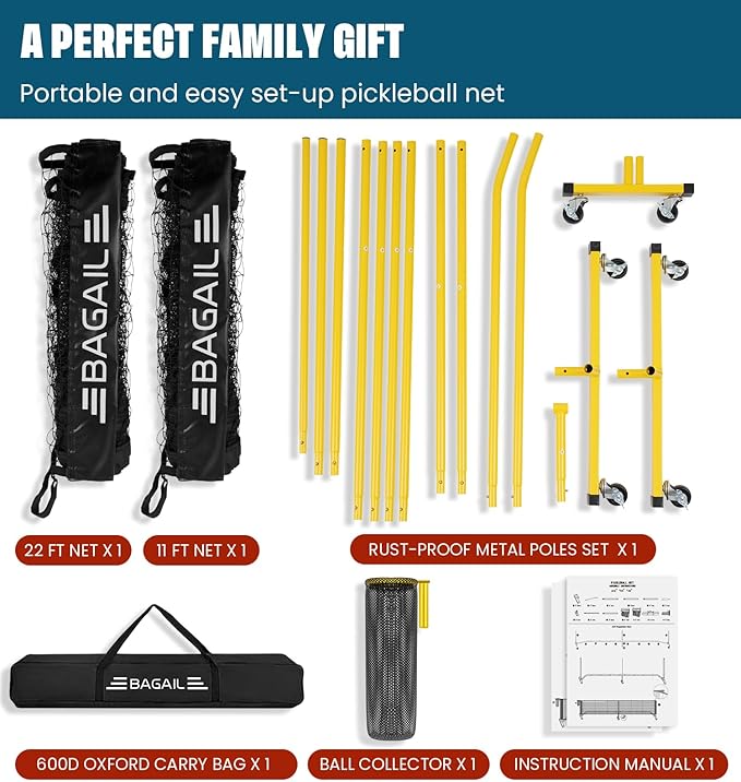 - 22FT or 11 FT Pickleball Net - BAGAIL's latest portable pickleball net features two nets - a full-size (36 "H x 22'W) USAPA regulation net and an 11'W half court practice net. Quickly assemble the frame system into 22FT or 11FT depending on your needs, and play with family or friends anywhere - in your driveway or on the indoor court. Suitable for players of all ages and skill levels. Whether practicing solo sessions or hosting social games, this 2-in-1 pickle ball net has you covered