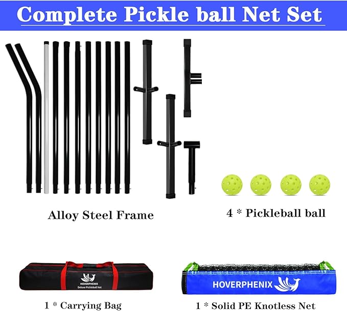 - PICKLEBALL NET WITH 4 OUTDOOR PICKLEBALLS, COMPLETE SET: This pickleball set includes official size pickleball net, 4 outdoor pickleball balls (40-holes), and a waterproof roomy carry bag. All you need to set up a funny backyard game is packed!