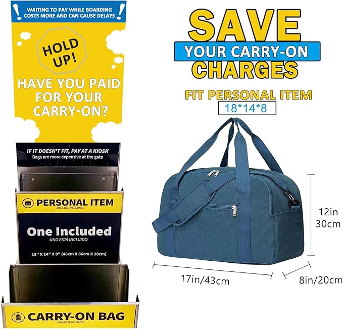 - Airline-friendly Travel Bag: 17x11.5x8 inch (Capacity 25L) perfectly fits Spirit Airlines and Frontier Airlines personal item bag size(18x14x8 inch). The travel duffel bag can be placed underseat, saving your carry-on fee.