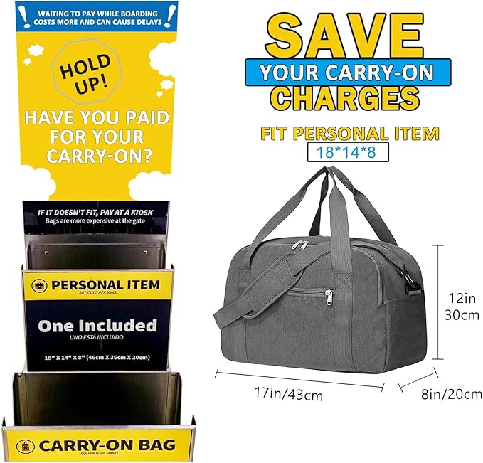 • Airline-friendly Travel Bag: 17x11.5x8 inch (Capacity 25L) perfectly fits Spirit Airlines and Frontier Airlines personal item bag size(18x14x8 inch). The travel duffel bag can be placed underseat, saving your carry-on fee.