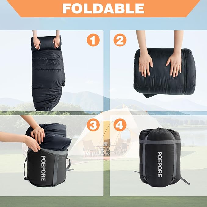 - Convenient Portability: The sleeping bag comes with a convenient storage bag, making it easy to roll up and stow away for transport and storage. These features make the POEPORE sleeping bag an ideal choice for enjoying comfort, warmth, and convenience during outdoor adventures, whether it's camping in the wilderness or relaxing indoors.