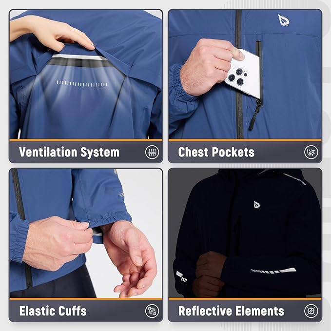 baleaf Men's Rain Jacket Waterproof Windbreaker Raincoat Running Cycling Hiking Gear Hood Lightweight Reflective Packable