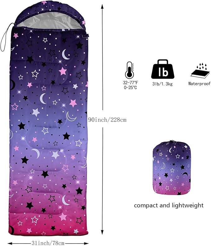 - Applicable For 3 Seasons: Our stars sleeping bag can be used temperatures ranging from 32°F-77°F Except for the cold winter,sleeping bag have weatherproof to prevent from dampness,Size is 31 x 90 inches