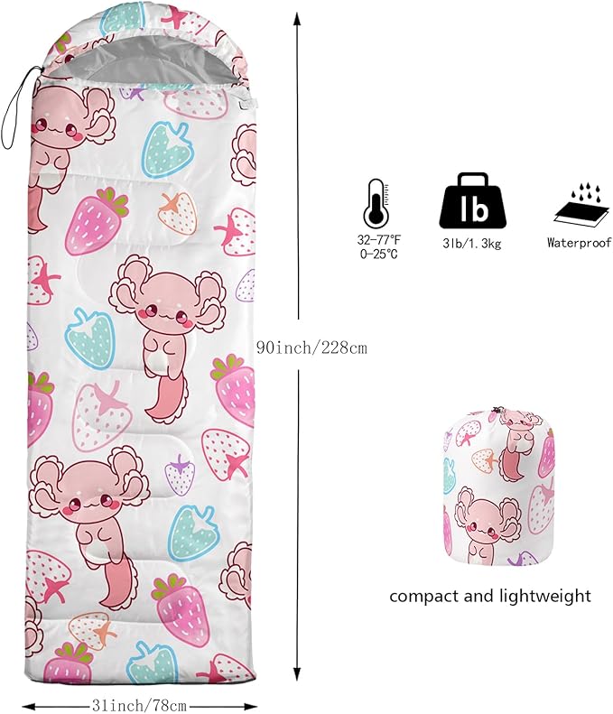 - Applicable For 3 Seasons: Our Axolotl sleeping bag can be used temperatures ranging from 32°F-77°F Except for the cold winter,sleeping bag have weatherproof to prevent from dampness,Size is 31 x 90 inches