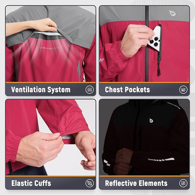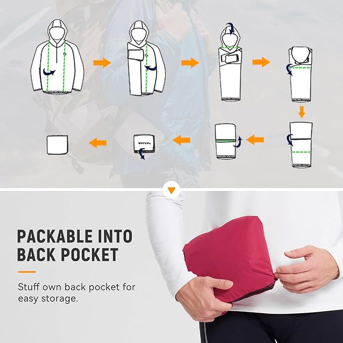 - Packable Hood: Mens cycling rain jackets with hood features drawstring, large enough to accommodate road riding and climbing helmets. The hood can be tucked into a velcro compartment by the collar when not in use.