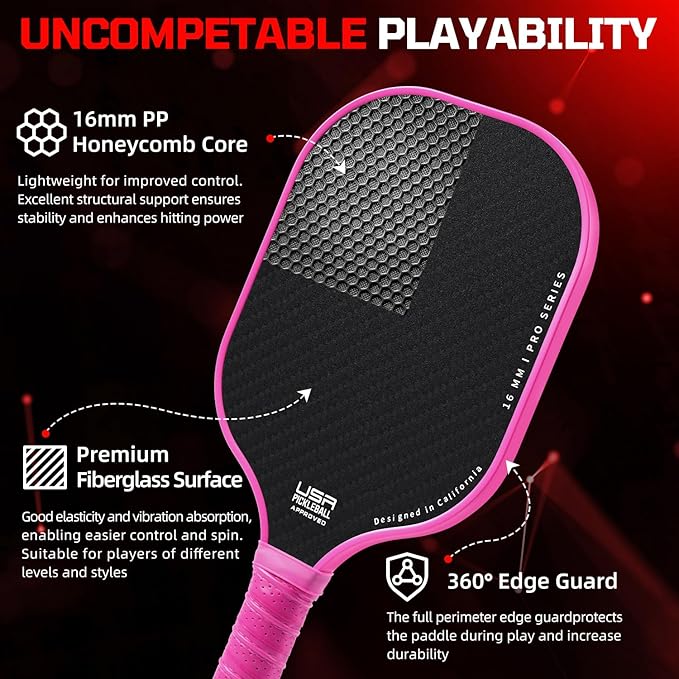 - Superior Construction: The paddles feature a unique fiberglass and polypropylene honeycomb core technology, providing exceptional power and control. The fiberglass surface offers excellent rotational performance and reduced vibration for optimal ball strike feel. Protective edge guards reinforce the frame to prevent wear from ground contact or ball impacts, extending the lifespan of the paddles
