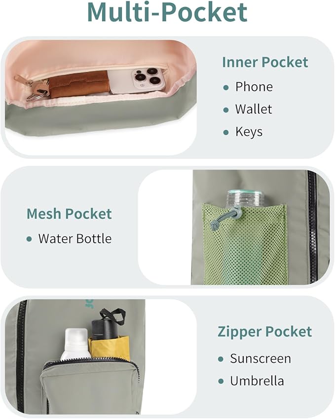 - 【Stay Neatly Organized】Exterior mesh pocket keeps your water bottle within reach. Zipper pocket holds quick-grab items like keys or sunglasses. Inside zip pocket keeps your phone and wallet secure.