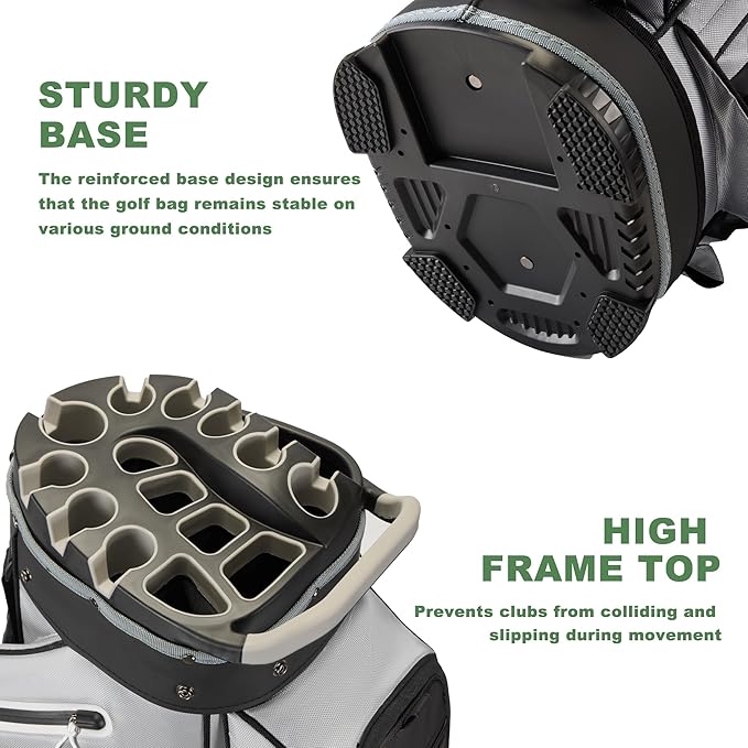 - 14-Way Full-Length Dividers + Putter Well:This golf cart bag features 14 separate compartments with a dedicated putter slot for full protection against impact damage. The putter hole cannot be used when clubs are full, and is suitable for up to 14 clubs at a time