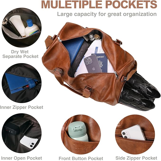 3-in-1 Leather Duffle Bag for Travel with Toiletry Bag and Shoe Compartment, Weekender Overnight Gym Bag for Men Women, Carry On Bag Fits 21 Inch Laptop