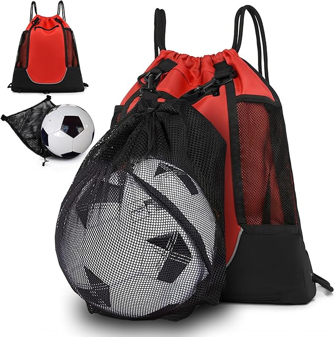 - Foldable & Detachable Mesh Ball Bag: When you receive the package, it is stored in a zipped pocket at the bottom of the red main backpack. You can take it out and attach to the backpack with 4 hooks. This soccer mesh bag is great for storing a size 7 soccer, basketball, football, volleyball, softball, rugby, etc. When not needed, it can be detached and well hidden in the zip pocket