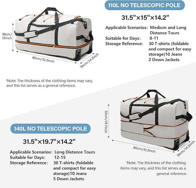 - [DIMENSIONS]: 31.5" L × 14.2" H × 15" W (110L) Standard,31.5" L × 14.2" H × 19" W (144L) Expanded
