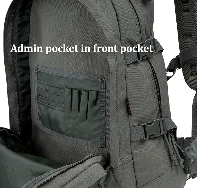 - MOLLE webbing built on front pocket for expanding attachment. Velcro loop panel on front for badges and patches. 2 ways zippers on all the pack. Mesh pockets and small admin panel on front pocket. 2 D rings on each shoulder straps for small gear hanging on.