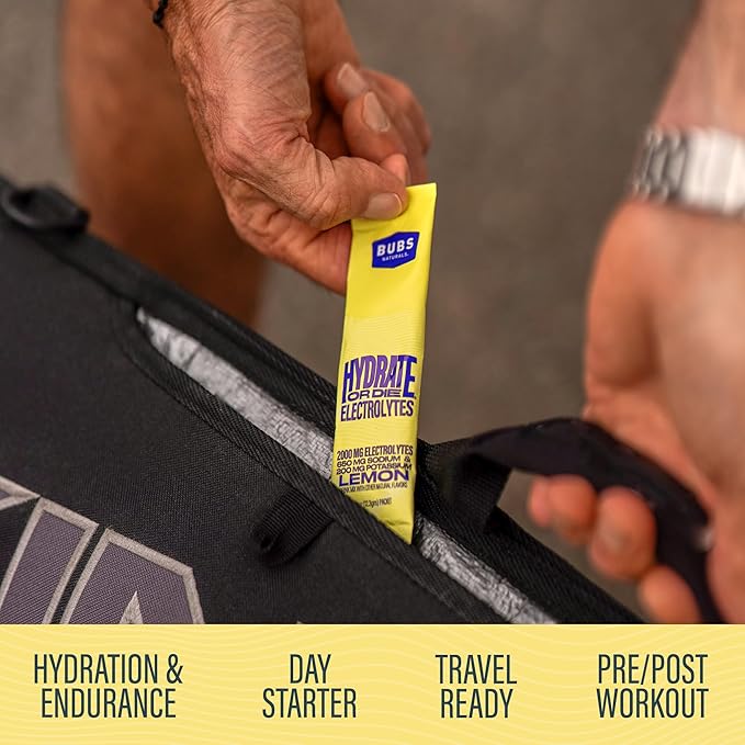BUBS Naturals - Hydrate or Die Electrolytes Powder Packets for Fast Absorption | Premium 2000mg Electrolyte Powder | for Sports, Recovery & Well-Being (Natural Lemon Flavor, 20 Sticks)