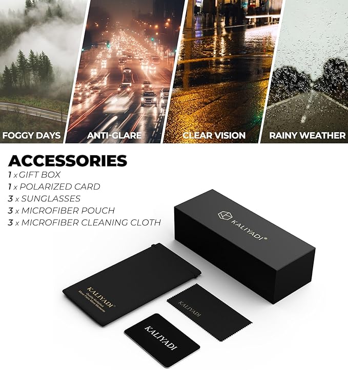 - Gift Ideas Package and Brand Customer Service: Classic night vision glasses*3, microfiber pouch*3, microfiber glasses cleaning cloth*3, gift box*1. KALIYADI night vision glasses are also gift packed, which will be great gifts for your family and friends! All KALIYADI customers enjoy brand customer service for our night glasses for driving. The integrity of every box and the quality of the lenses are double checked by third-party companies. And that goes with a lifetime support!