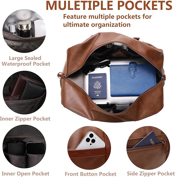 Weekender Bag for Women Men, Large Overnight Bag Faux Leather Travel Duffel Bag with Shoe Compartment Toiletry Packing Cube Carry On Bag Fit 21" Laptop 3Pcs Set (4PCS Brown)
